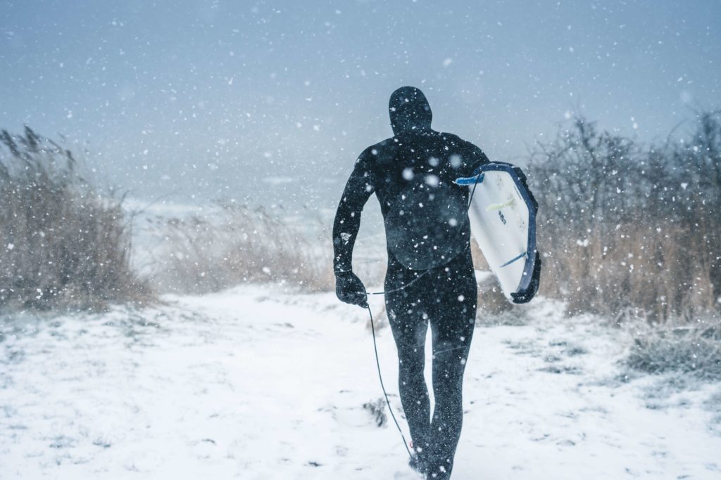Embrace the winter wonderland vibes as you conquer the frosty waves, where snowy landscapes meet the thrill of surfing.